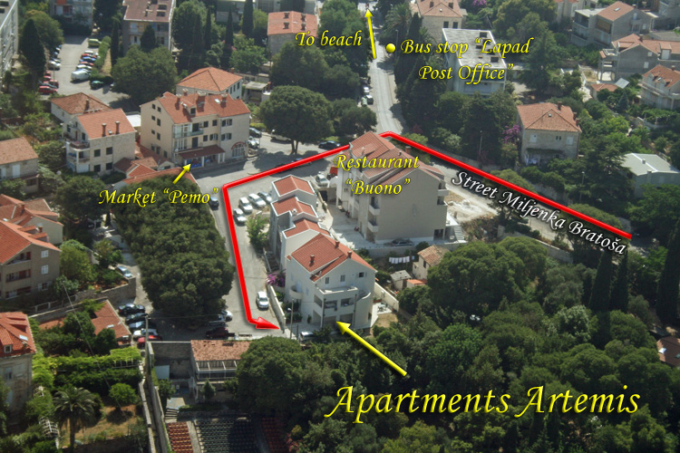 Apartmani Artemis smješteni su na poluotoku Lapad u najmirnijem dijelu grada Dubrovnika, a u neposrednoj blizini svih najvažnijih turističkih sadržaja. Na samo stotinjak metara od objekta nalazi se najljepša gradska šetnica Uvala, prelijepa pjeskovita plaža, trgovački centar, tržnica, ljekarna, ambulanta, bolnica, banka, poštanski ured, tenis tereni, brojni restorani, hoteli, taxi i autobusno stajalište. Stara gradska jezgra udaljena je tri kilometra i dobro povezana brzom autobusnom vezom.